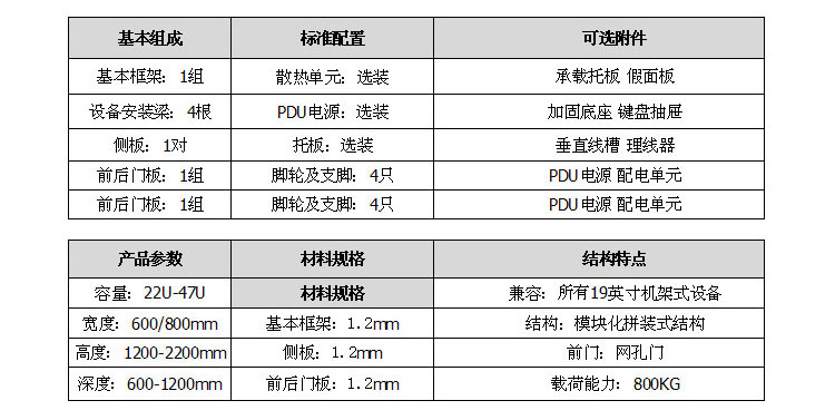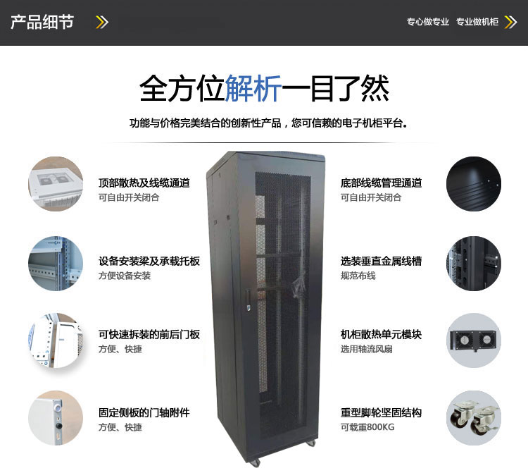 ·平面冷軋鋼板后門;前門配黑色旋轉(zhuǎn)鎖,后門小圓鎖;·頂部安裝過濾散熱風(fēng)扇,供設(shè)備散熱;左右側(cè)門可開,可選配加鎖;頂?shù)卓烧{(diào)節(jié)的進(jìn)線孔;·底部安裝調(diào)整腳及萬向輪,方便移動,固定及調(diào)整水平;·前后焊接框架,可散件出貨;