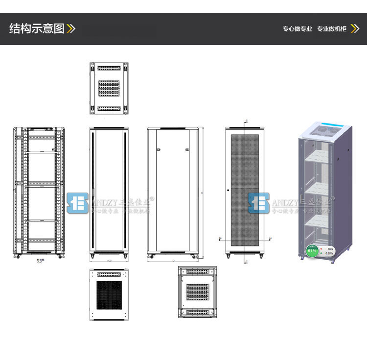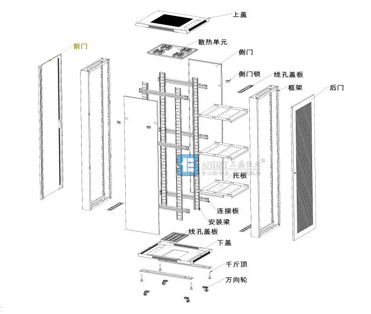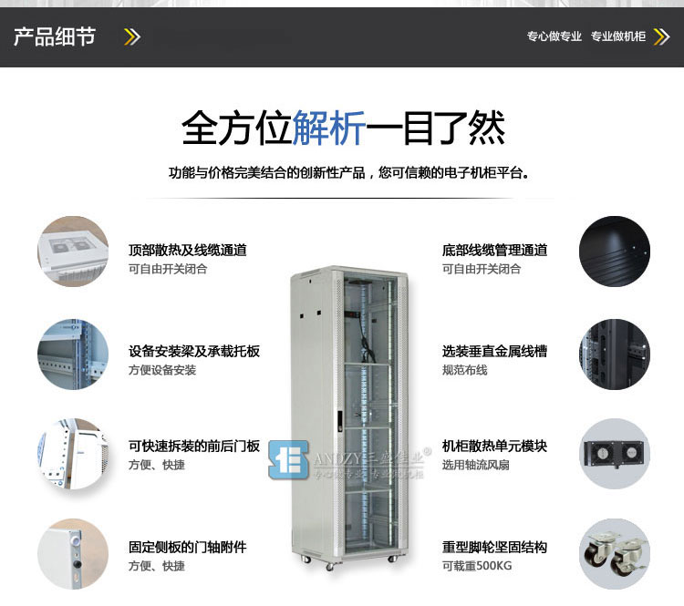 ·平面冷軋鋼板后門;前門配黑色旋轉(zhuǎn)鎖,后門小圓鎖;·頂部安裝過濾散熱風(fēng)扇,供設(shè)備散熱;左右側(cè)門可開,可選配加鎖;頂?shù)卓烧{(diào)節(jié)的進(jìn)線孔;·底部安裝調(diào)整腳及萬向輪,方便移動,固定及調(diào)整水平;·前后焊接框架,可散件出貨;
